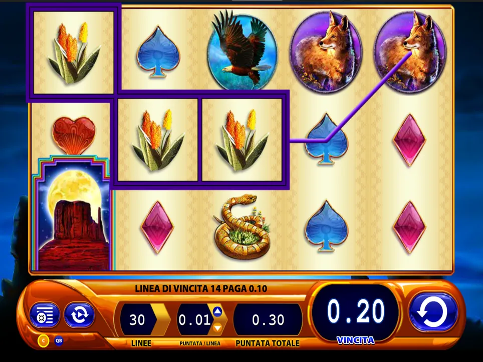 Played on 5 reels with 3 rows on 30 adjustable paylines. The game has no multipliers but two wild symbols in the form of the buffalo:
