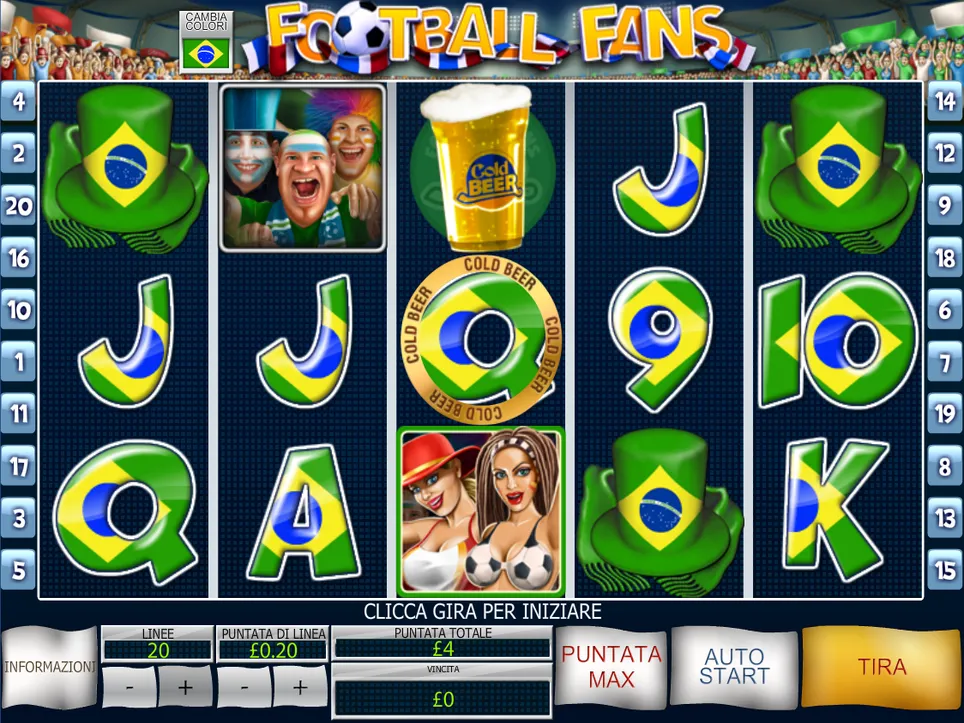 The online slot game Football Fans is characterized by game symbols that are displayed on 5 reels and can form a maximum of 20 paylines.