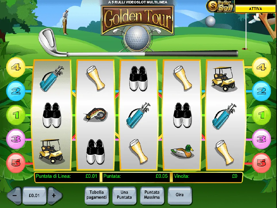 Wild and scatter symbols also appear in the Golden Tour online slot. The wild symbol is the double golf ball, which can substitute for the golden or white golf ball, providing extra wins. In Golden Tour, the return to player is 97.71 percent, so the chances of winning are high. Also, counting wild symbols in both directions allows for multiple winning options that attract new gamblers.