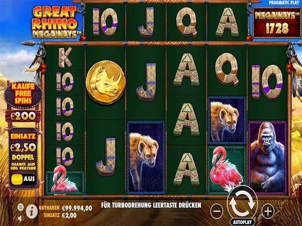 The theme of Great Rhino Megaways are the big animals of the African continent. These include the rhinoceros, of course, but also crocodiles, hyenas and flamingos. In addition, there are some classic playing card symbols that you know from many German slot games. A nicely designed background and musical effects complete the coherent overall picture. For newcomers to online casinos, Great Rhino Megaways might seem a bit confusing. In the paytable, you can view all the rules of the slot without registering.