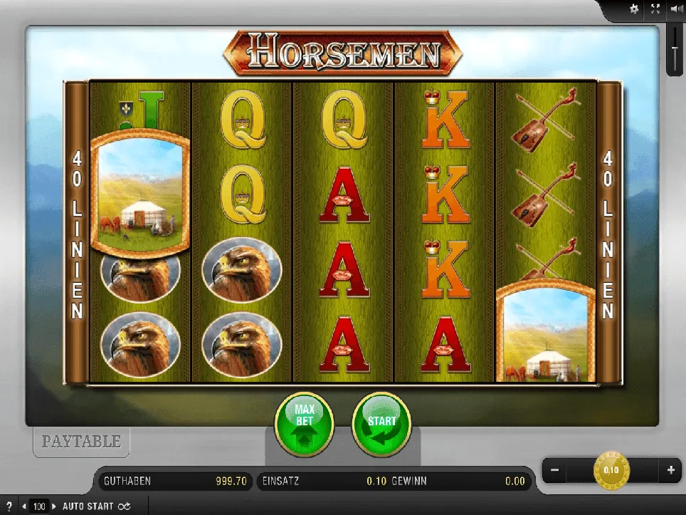 Horsemen by Bally Wulff has 5 reels and 40 paylines. The game is set in the Mongolian wilds and the main feature is the free spins feature onwards, where you can initially get up to 50 free spins. The horse symbol in Horsemen online becomes an additional wild for your free spins.