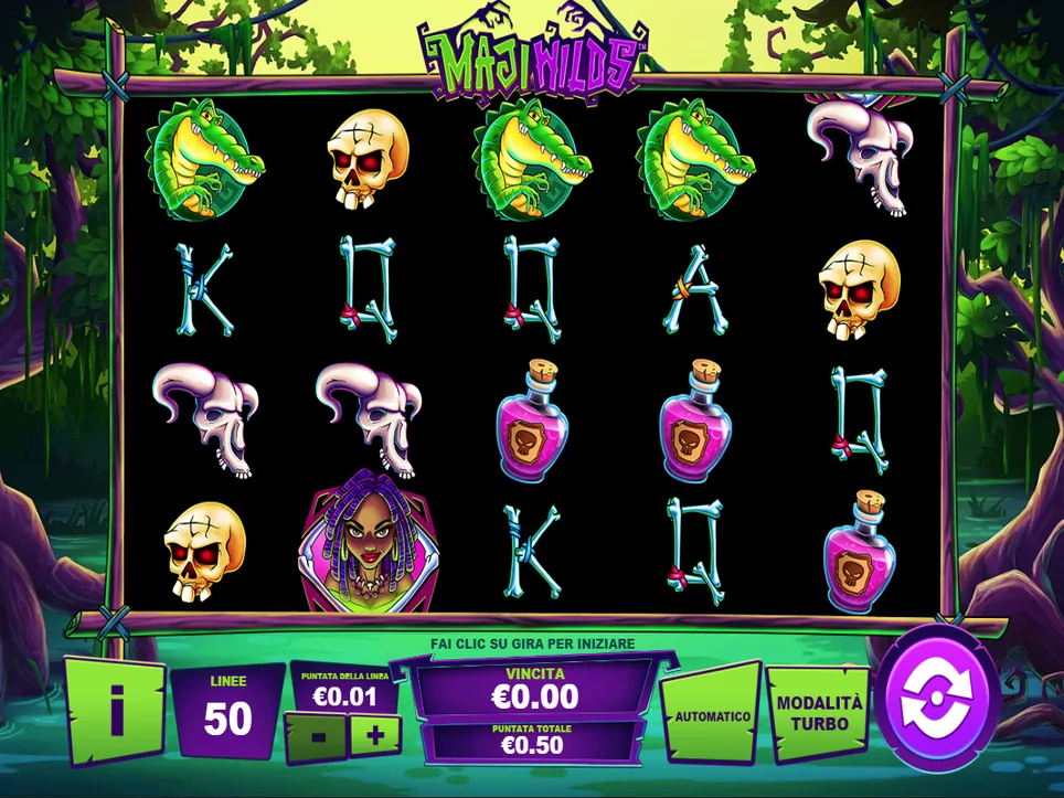 At the beginning, the player sets his line bet. This can be between 0.01€ and 1€. To start the Maji Wilds game, the player simply presses the purple button with the two arrows and the reels start spinning. However, if you find it too slow, you can increase the speed of the game by activating the turbo mode. In addition, the auto-play feature is available to the player, so that every round does not always have to be started by itself.