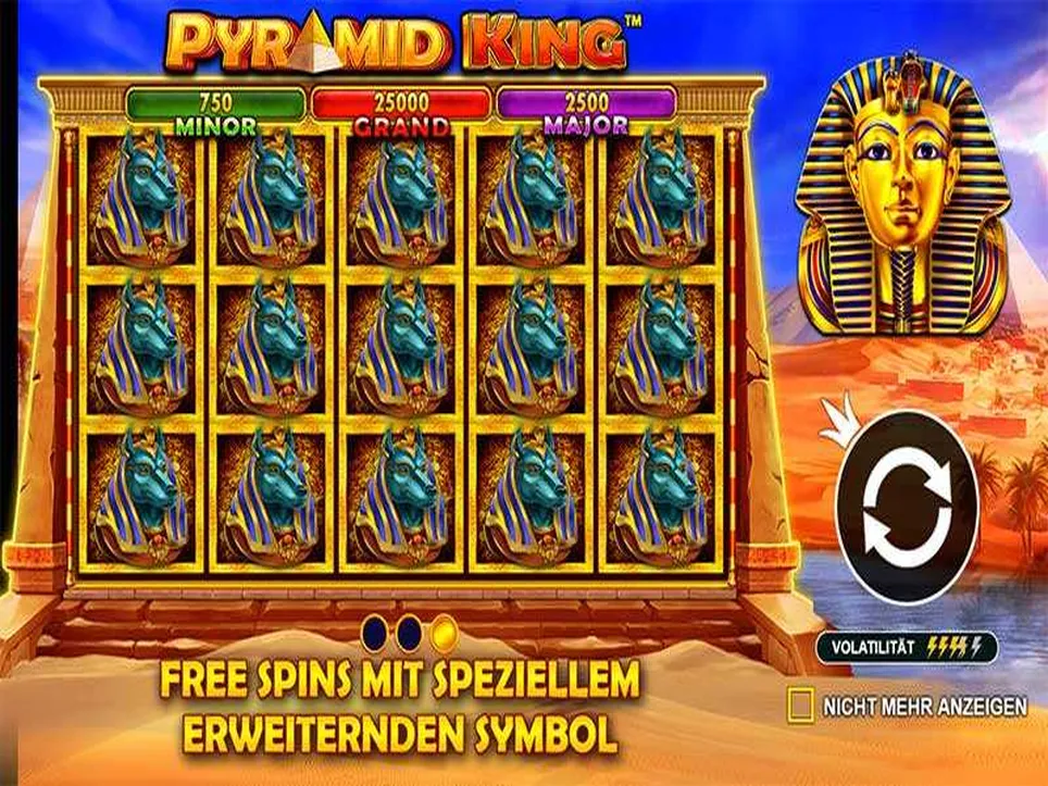 Pragmatic Play has equipped Pyramid King with a medium to high volatility – at least that’s how the manufacturer presents it. However, the maximum win turns out to be manageable with 2,500 times the stake. The payout ratio (Return to Player, RTP) is 96.5% according to Pragmatic Play. Players wager €0.25 to €125 per spin. What happens to the stakes is decided on five reels and three rows. There are 25 paylines.