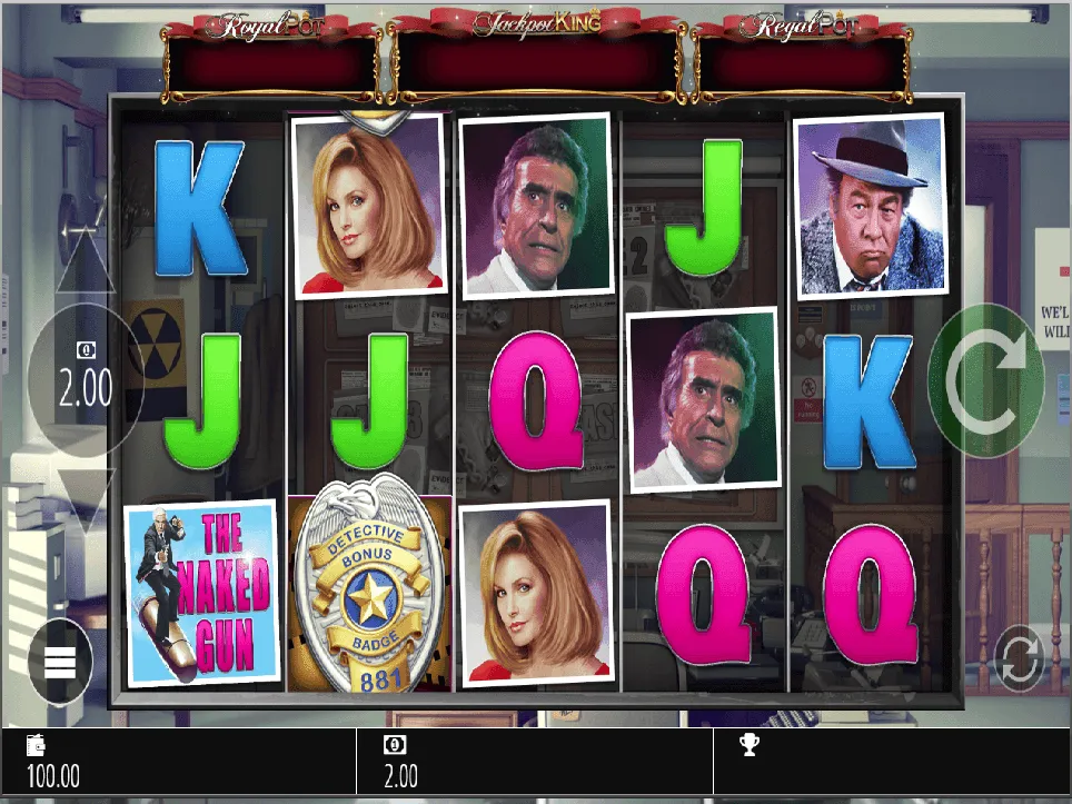This slot game by Blueprint is based on the hilarious comedy spectacle “The Naked Gun” starring Leslie Nielsen. You are accompanied by the typical naked gun slapstick sound.