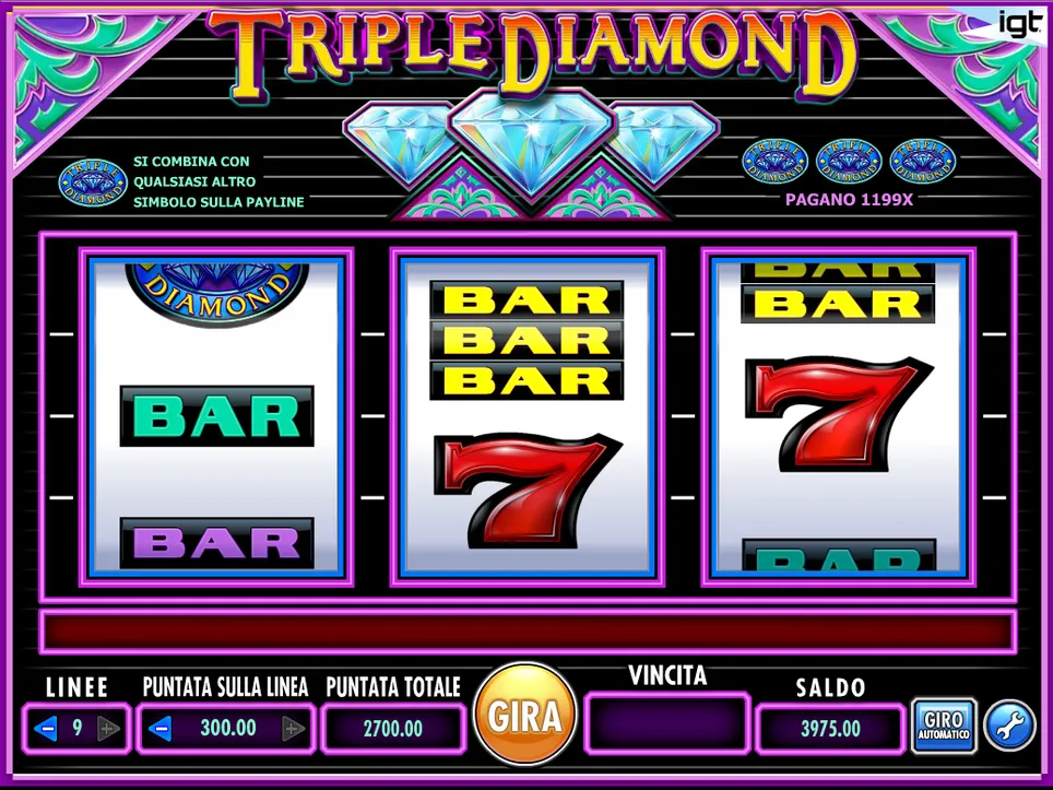 Fans of traditional slot machines take note! Triple Diamond online might just meet your taste. If you have tried some of IGT’s new creations lately, you know that the gameplay there is often very innovative and highly complex. But not with Triple Diamond. The slot game scores with ultimate simplicity and comes in the style of old retro slots. Here you can play Triple Diamond for free and see for yourself