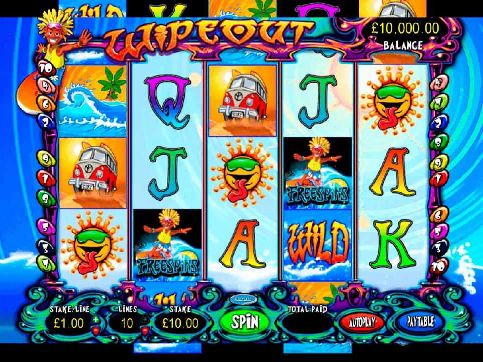 The highest wins in Wipeout are certainly still interesting: should you spin 5 Wilds along a payline, you will get 250 times the bet. For the wave 200 times, the bus 150 times, the sun 120 times. For playing cards you get a little less.