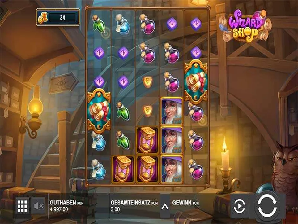 The owner of the magic store is a magician of the old school and he even appears as one of the main characters on your reels when playing Wizard Shop. If so many motifs of the magician land on a reel that the entire reel is filled with them, then the wizard turns into a giant stacked wild symbol. Starting from this giant wild, all other motifs of the wizard that landed in the same spin now become wild symbols as well. This can create numerous winning combinations that can bring you incredible winnings. By the way, the extent of the wizarding powers of this bonus feature already becomes apparent when you play Wizard Shop for free without registration.